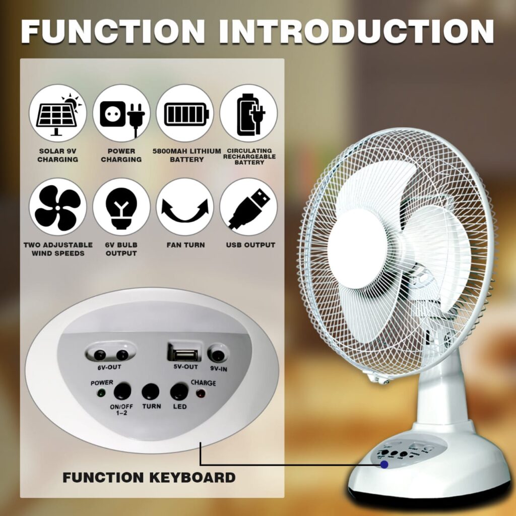 This advanced solar-powered system combines a high-performance table fan, two energy-efficient LED bulbs, and a durable solar panel β€” providing reliable comfort and lighting even in the absence of electricity.